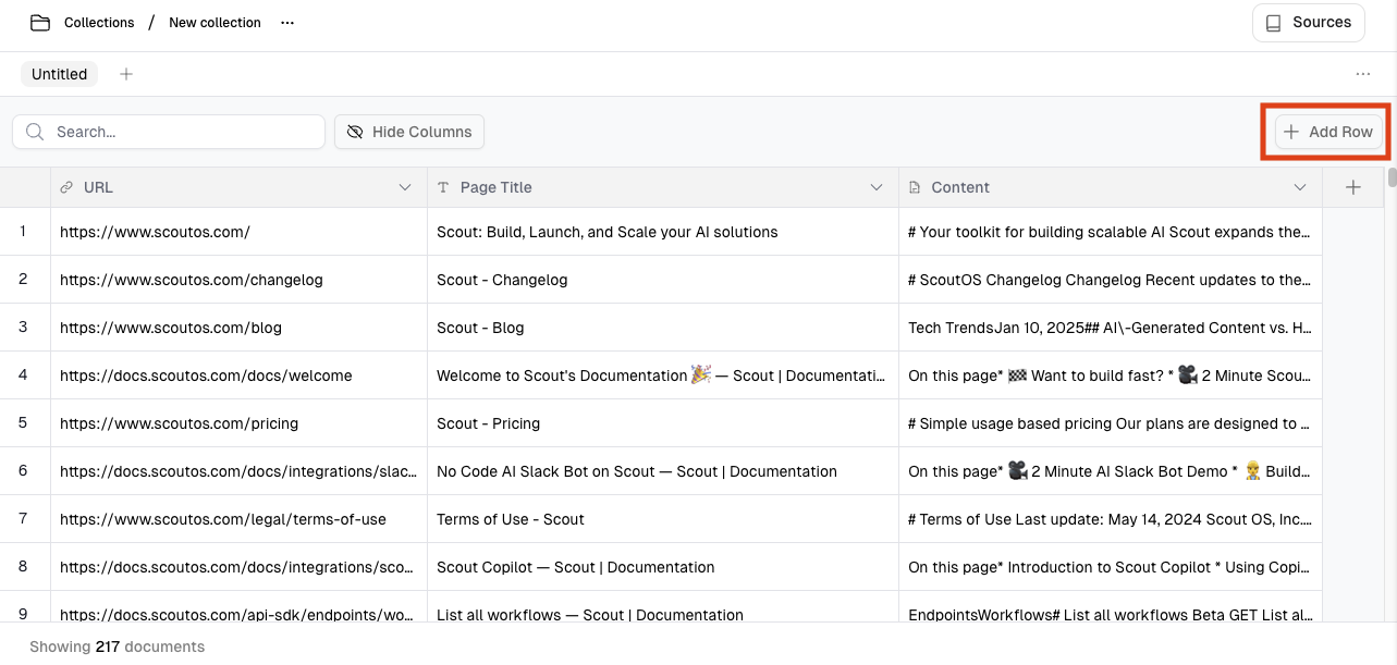 Documents can be added manually to a database table within Scout. This process allows for quick and precise control over the document’s content and other columns, ensuring that each document is customized to meet specific requirements.