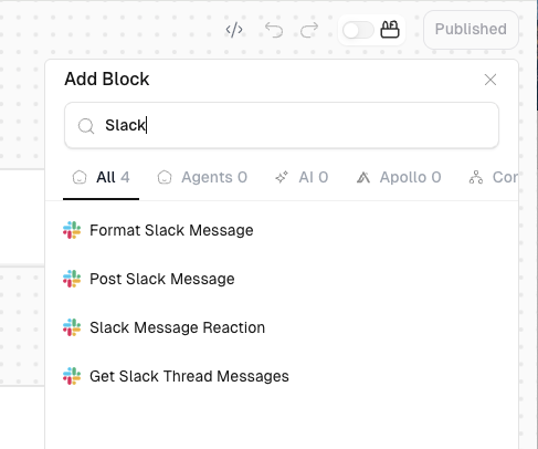 - Find the integration tools as blocks in your Workflows. Note: Not all integrations provide workflow blocks. See more info about Workflows here.