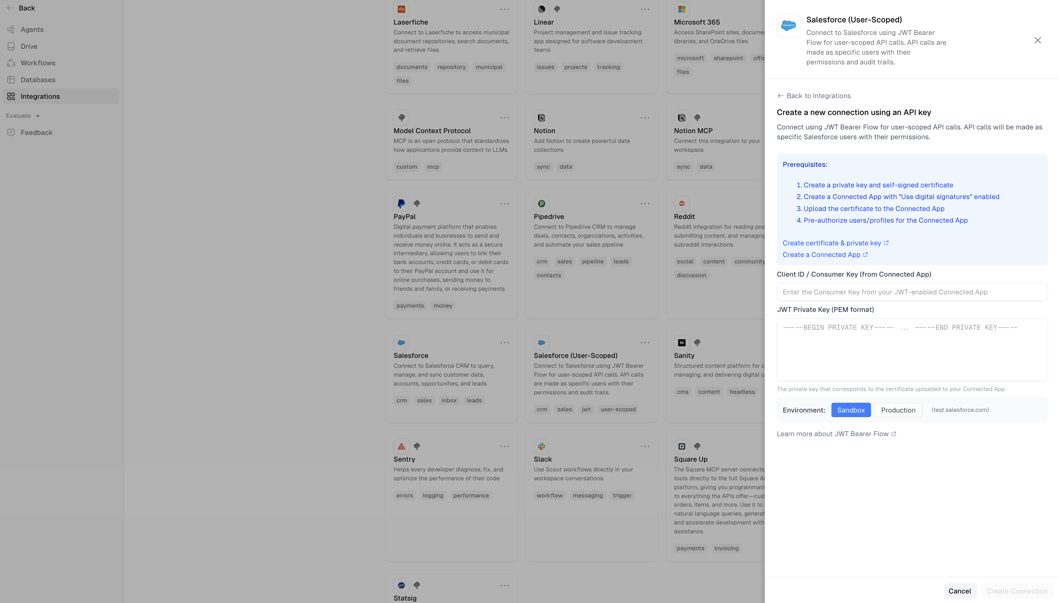 For server-to-server integrations using certificate-based authentication. This method allows Scout to authenticate as a specific Salesforce user without interactive login, ideal for automated workflows and backend integrations.