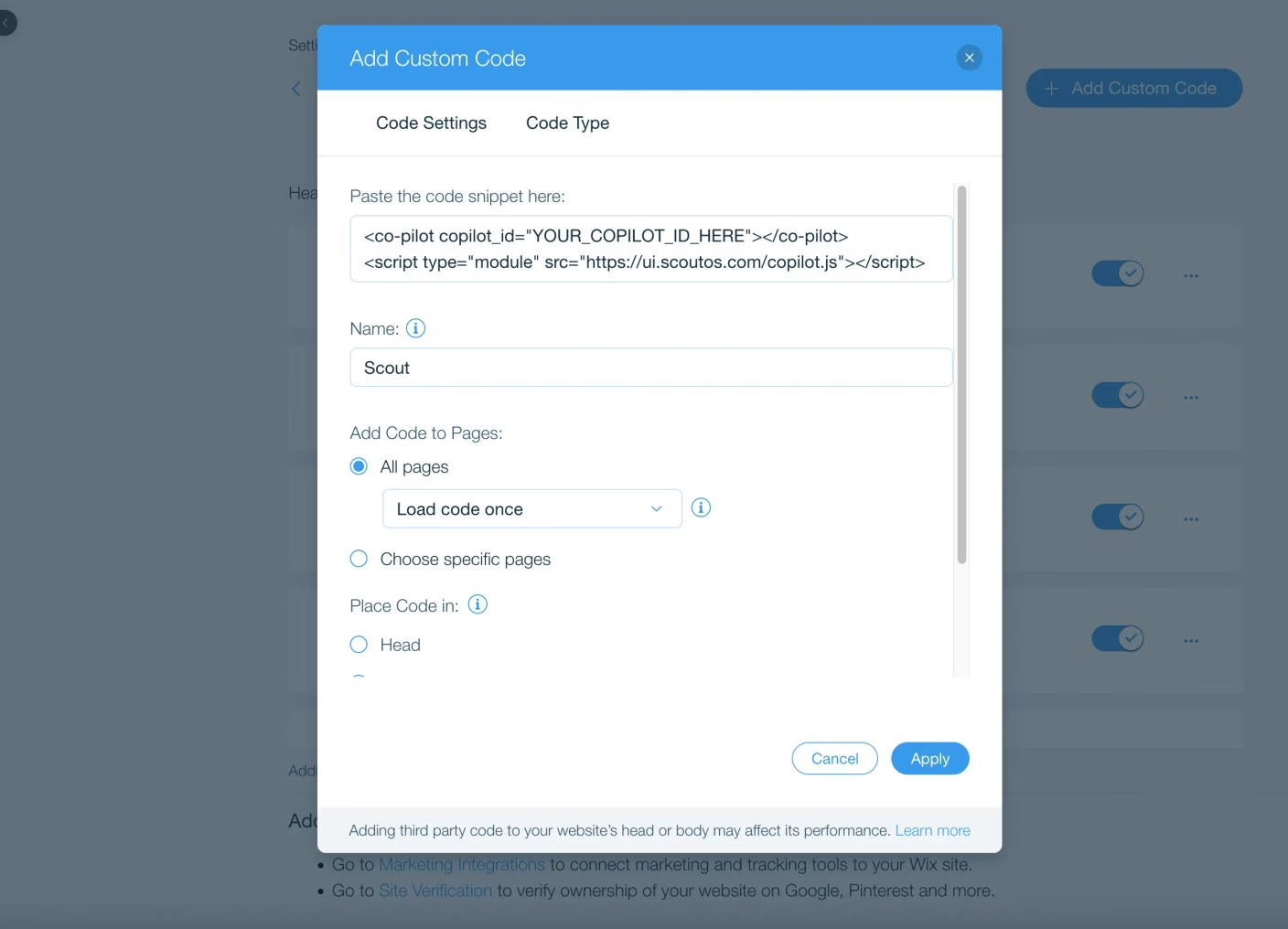 Obtain the Code: Once your copilot is ready, get the integration code snippet from Scout Copilot documentation.