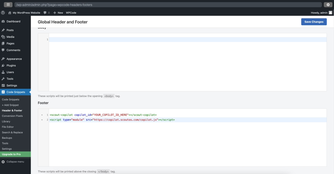 - In Code Snippets select the Header & Footer option and paste your integration code into the footer section.