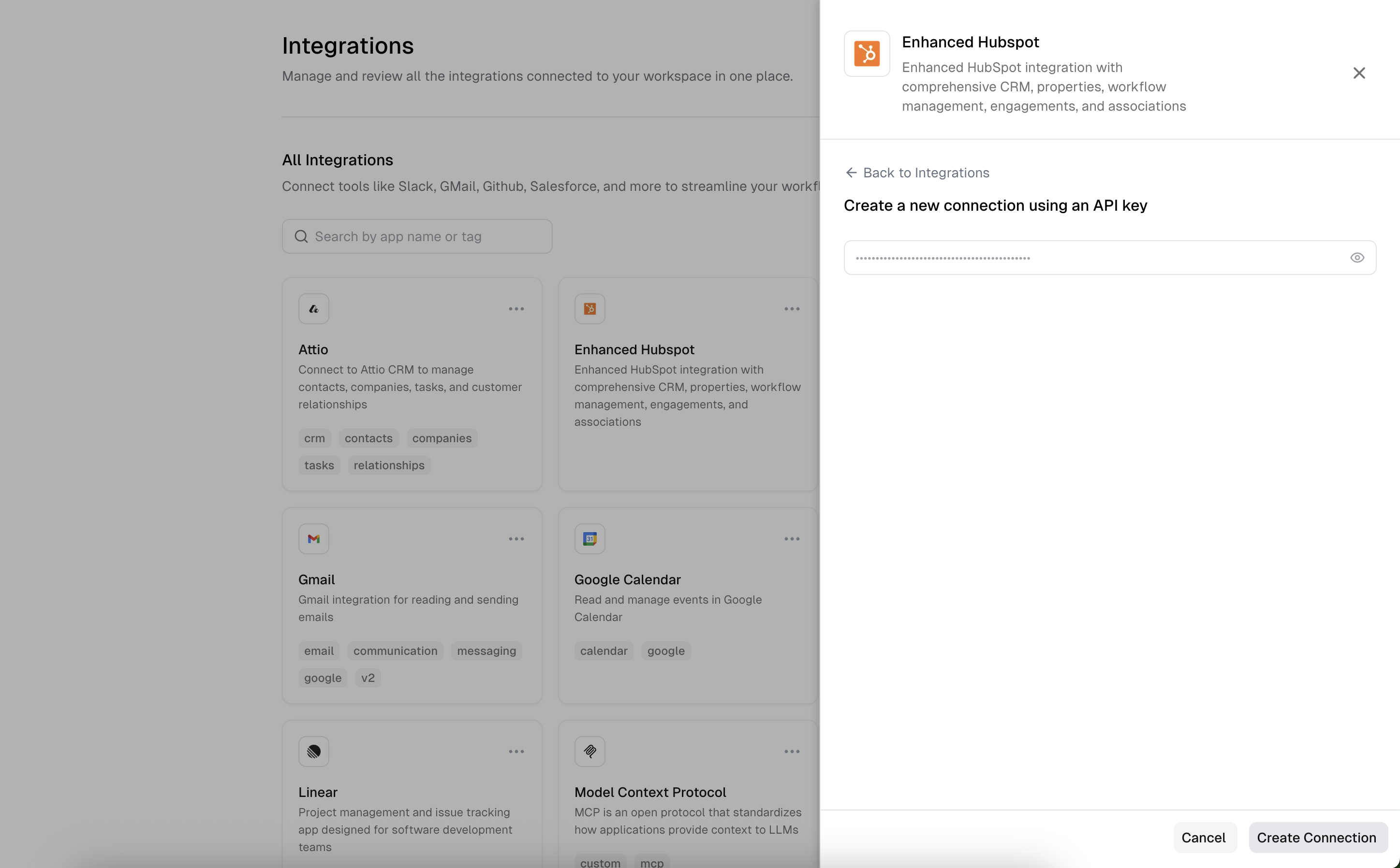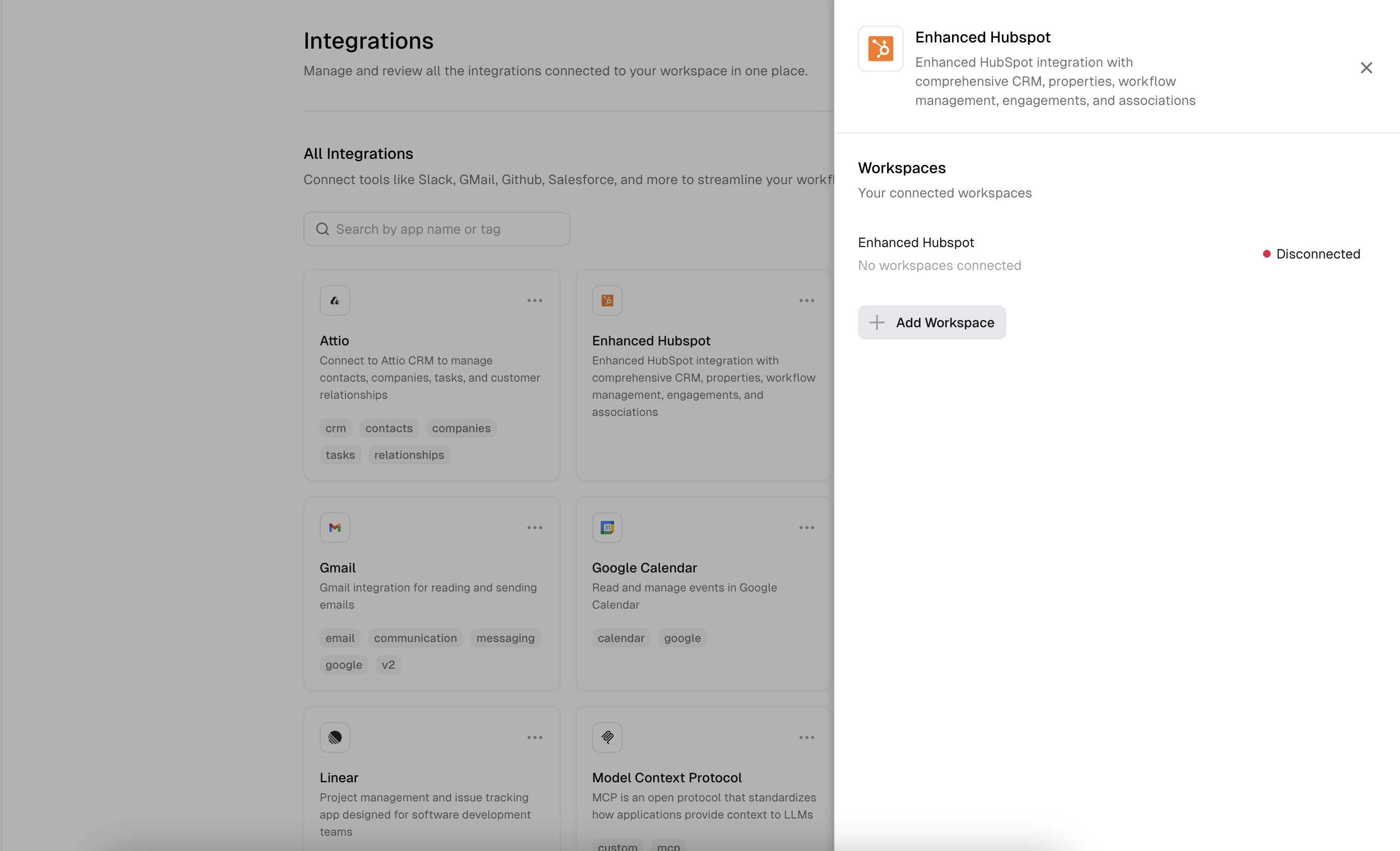 - You can test your connection by giving one of your agents access to the HubSpot integration in the agent tools section.