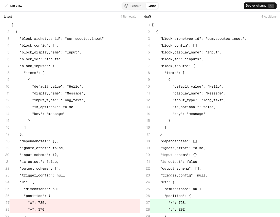- Block changes: Blocks that were added, removed, or modified are clearly highlighted